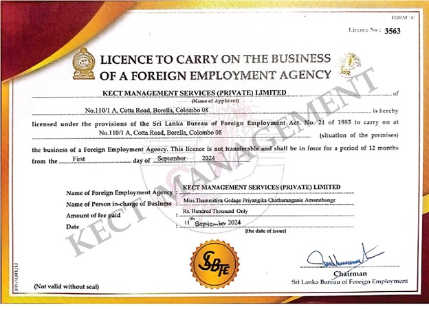 KECT Management Services Services (Private) Limited. has emerged as a reputable and internationally recognized recruitment organization based in Sri Lanka. The company is duly incorporated as a private limited entity and is officially licensed by the Sri Lanka Bureau of Foreign Employment (SLBFE) under License No. 3563, authorizing us to operate in full compliance with national and international labor standards.